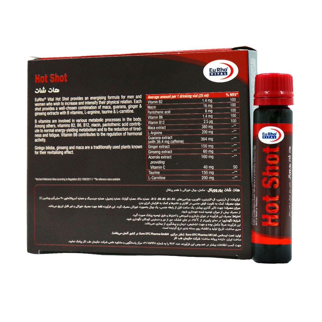 ویال هات شات، مکمل تقویت کننده قوای جنسی هات شات، مفید در افزایش میل و عملکرد جنسی دارای عصاره گیاهان ماکا، گوارانا، زنجبیل، جنسینگو آسرولا حاوی ویتامین های گروه ب، ال-آرژنین، تائورین و ال کارنیتین ویال هات شات برای کمک به افزایش سطح انرژی و رفع خستگی کمک به بهبود نعوظ با تحریک تولید نیتریک اکسید هات شات یوروویتال، قابل استفاده در بانوان و آقایان به فرم محلول خوراکی با طعم دل پذیر پرتقالی